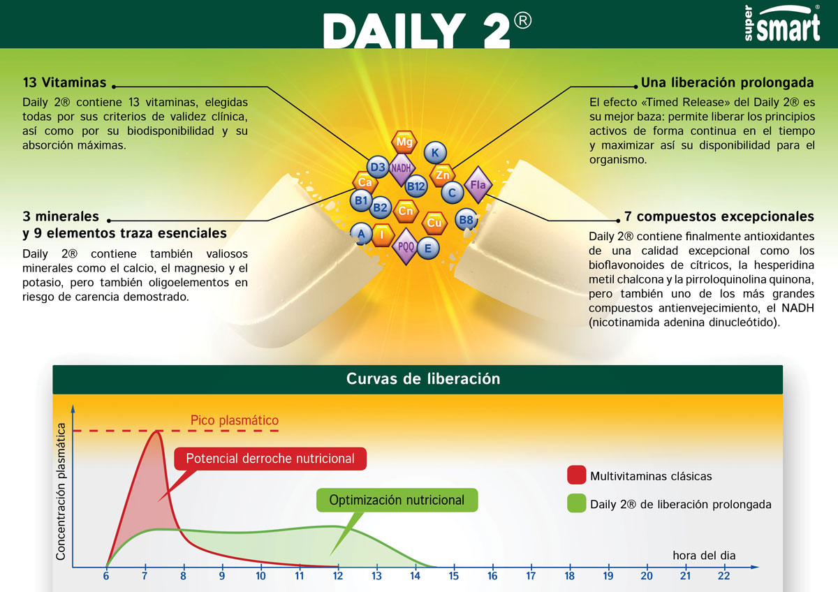 Esta nueva fórmula multivitamínica es probablemente la quintaesencia de lo que pueden ofrecer hoy en día los suplementos nutricionales en cuanto a prevención, protección y potencial terapéutico. Daily 2® tiene una gran ventaja: su soporte farmacéutico se ha estudiado para liberar todos los ingredientes activos de forma prolongada.