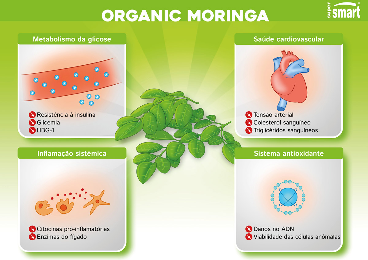 - Contribui para baixar o nível de açúcar no sangue. Tal como a berberina, a Moringa consegue baixar a glicémia em jejum e a glicémia pós-prandial. Num ensaio clínico humano (2), a toma de um suplemento durante 40 dias permitiu baixar em cerca de 30% a glicémia dos participantes com diabetes de tipo 2. Estes efeitos ficar-se-iam a dever aos compostos isotiociânicos existentes nas folhas de Moringa. Aumentam, nomeadamente, a sensibilidade dos tecidos periféricos à insulina (3) e reduzem a atividade da sucrase intestinal.