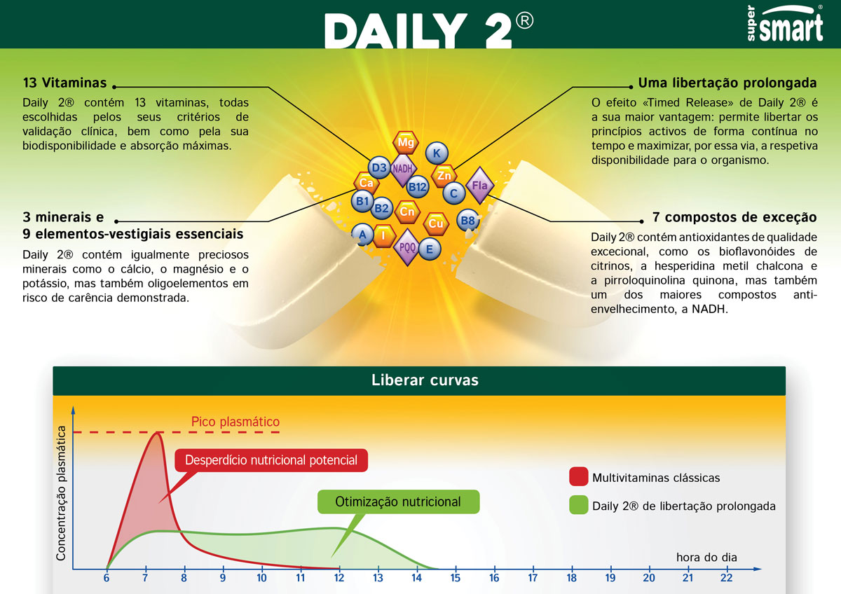 Esta nova fórmula multivitamínica é provavelmente a quinta-essência do que, atualmente, pode fornecer a suplementação nutricional em termos de prevenção, de proteção e de potencial terapêutico. Daily 2® apresenta sobretudo uma vantagem considerável: o seu suporte galénico foi estudado para libertar o conjunto dos princípios ativos de forma prolongada no tempo.